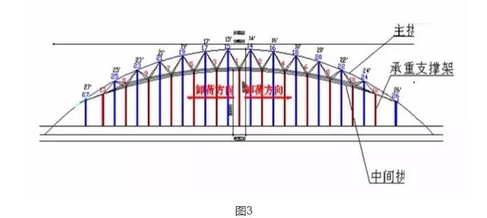 5)待所有支撐點(diǎn)上的臨時(shí)千斤頂支撐到位、頂緊后,按照從中間到兩邊的順序逐漸拆除原臨時(shí)的支撐,讓主拱逐步落位在千斤頂支托上。