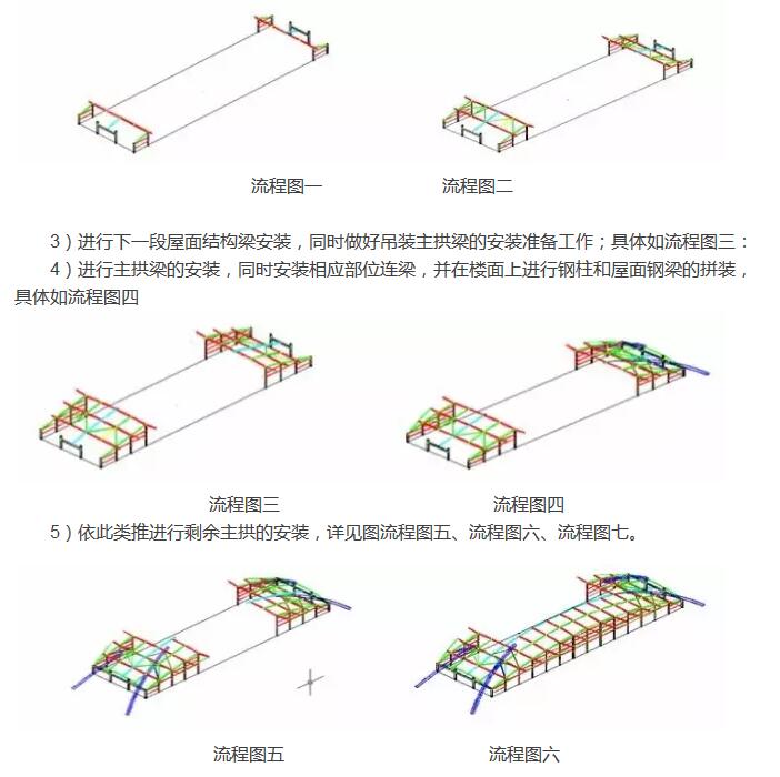 2)為了使屋面結(jié)構(gòu)形成穩(wěn)定的體系,所以對(duì)兩端第二段中間拱進(jìn)行安裝,并進(jìn)行兩端屋面梁和鋼柱的拼裝安裝,同時(shí)對(duì)兩端屋面梁之間的連梁和水平剪刀支撐進(jìn)行安裝,具體如流程圖二: